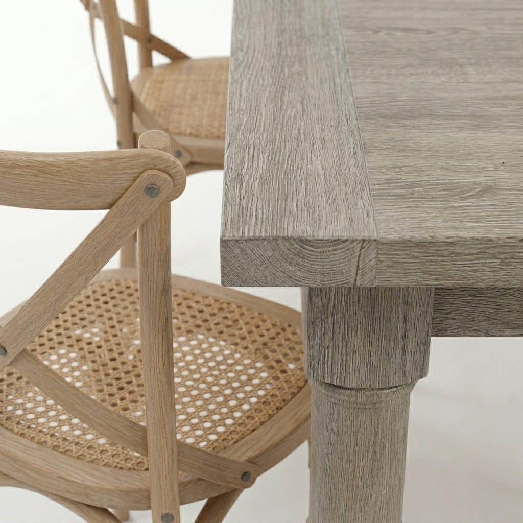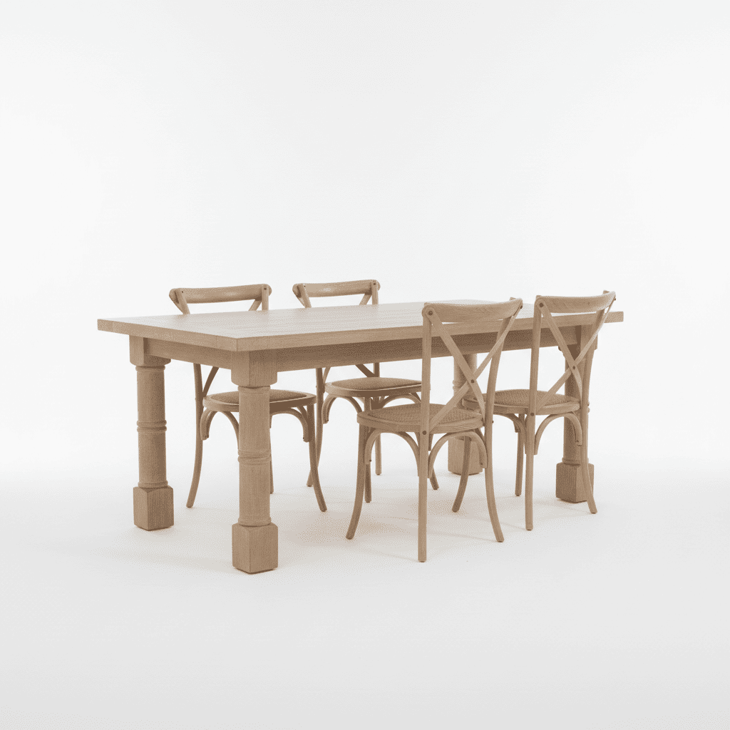El Juego de Comedor Torneado (Línea Country-Chic) es una propuesta de gran porte que rescata la tradición de la carpintería artesanal para adaptarla a los hogares modernos que buscan calidez y carácter.
